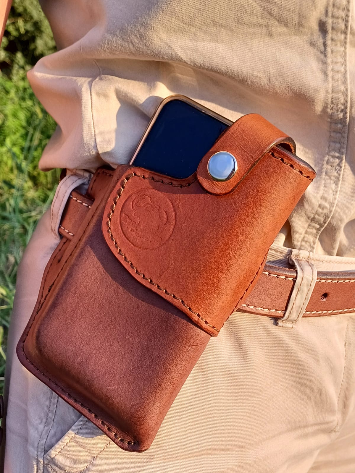 The Cell Phone Vertical Open is made of the best quality leather. This handmade pouch can feature a press stud that locks the strap of the pouch. It has two loops to insert your belt to wear it comfortably on your waist. Each customer’s measurement is used to customize a perfect fit.