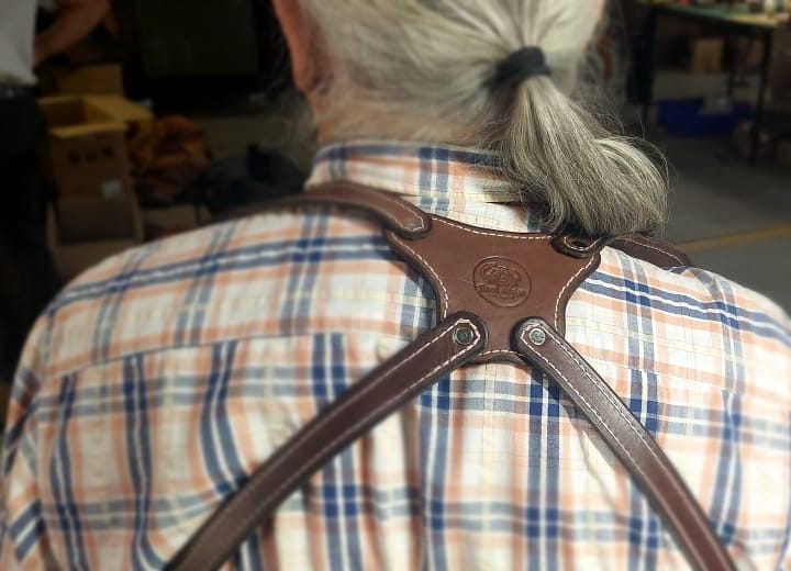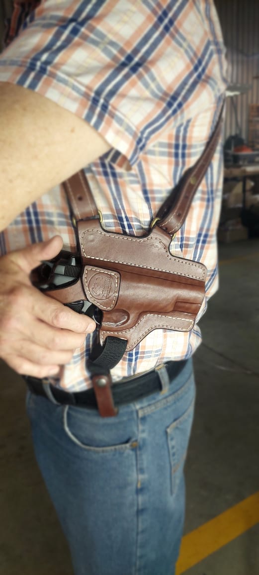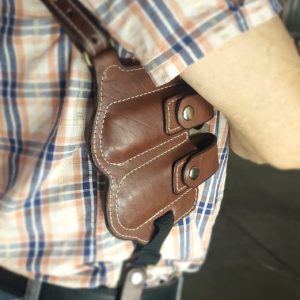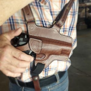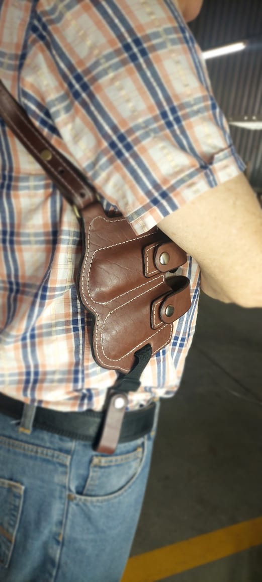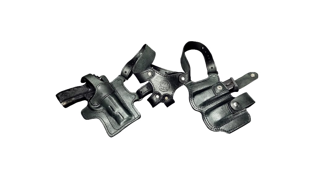 Leather Horizontal Underarm Double Harness & Double Mag Pouch Closed Flap for pistols, custom-made to fit your weapon perfectly.