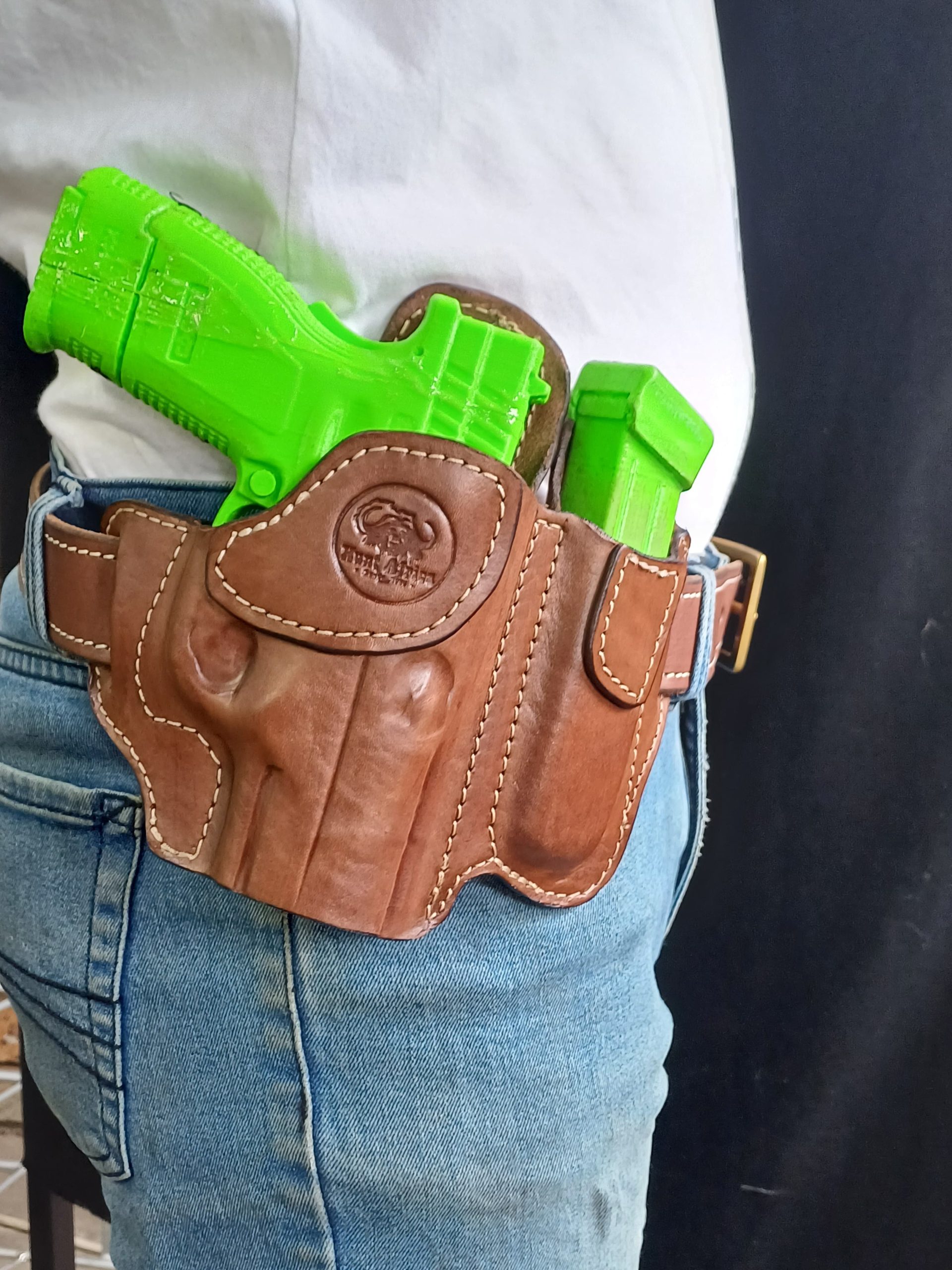 Handmade outside waistband leather pistol holder & magazine pouch, custom-made to fit your pistol.