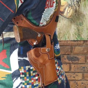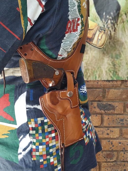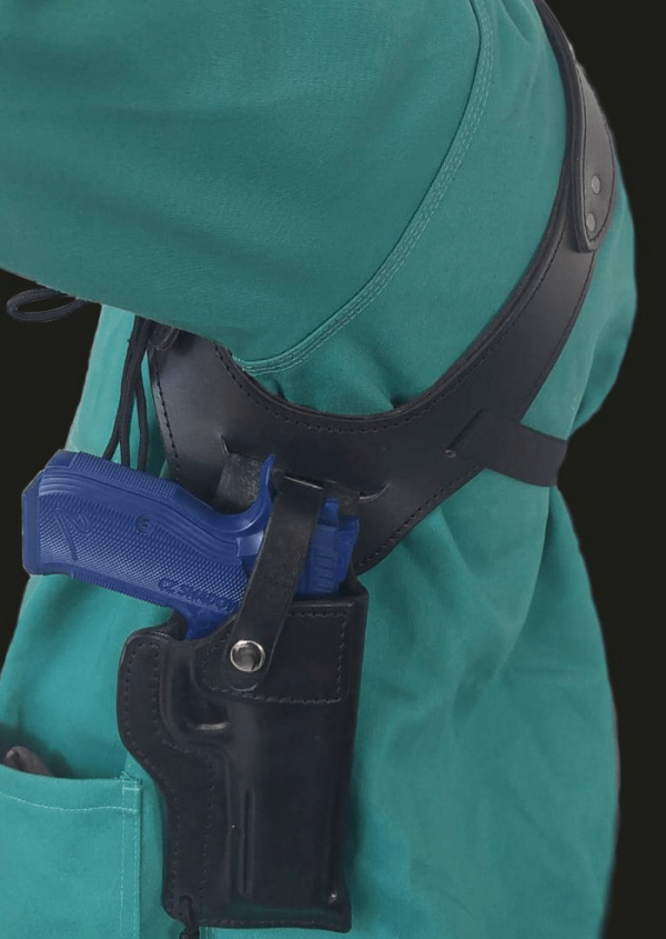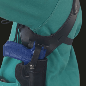 Leather underarm holster & harness for pistols, custom-made to fit your weapon perfectly.