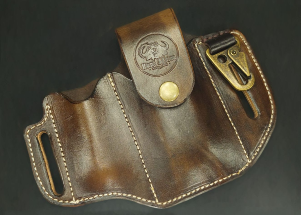 The Multi-Tool Leather Pouch Plus One HK Hook plus one comes with a HK hook. This product is suitable for any work, travel, and outdoors, it is compact and light and fits perfectly on your waist through the loops. The open pouch is perfect to insert a lighter or small pocket knife.